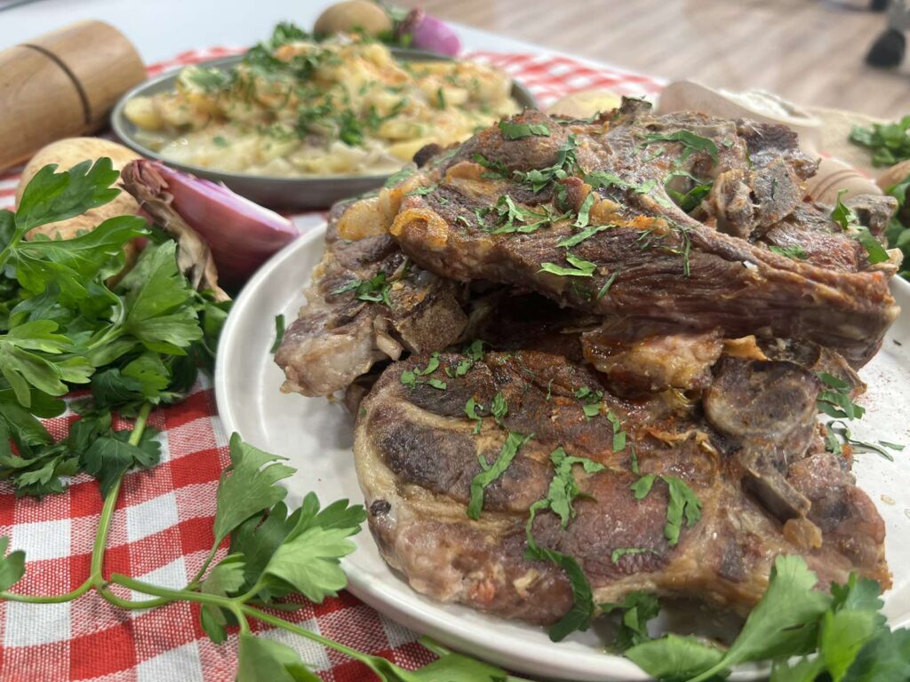 Χοιρινές μπριζόλες με στρώση πατάτας-κρεμμύδι
