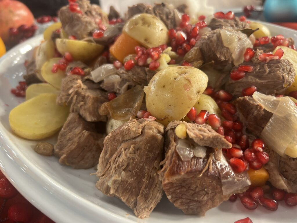 Μοσχάρι με ρόδι, σταφίδες και κουκουνάρι