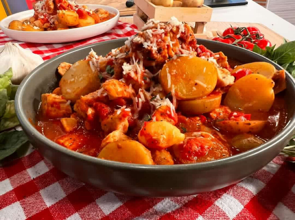 Κοτόπουλο αραμπιάτα με πατάτες και τριμμένο πεκορίνο