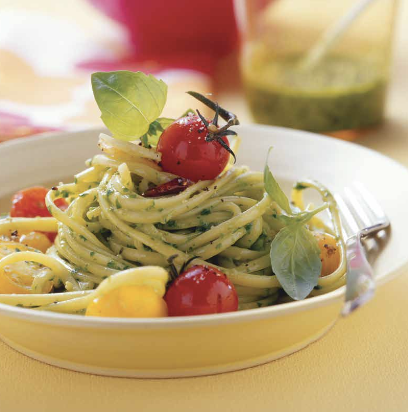 Λινγκουίνι με πέστο αλα τζανοβέζε και ψητά ντοματίνια