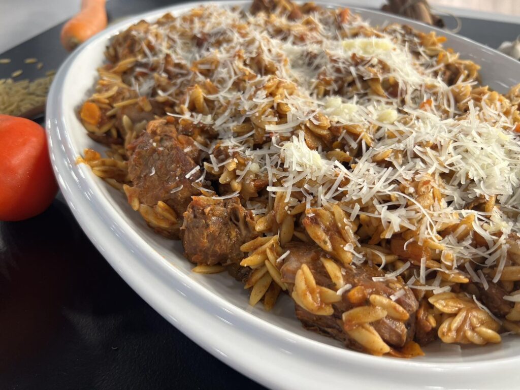 Μοσχάρι με ρόδι, σταφίδες και κουκουνάρι