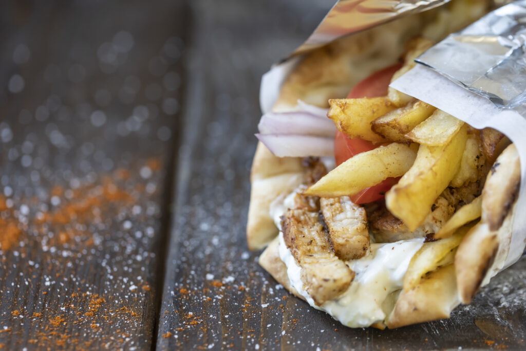 Κεφτεδάκια προβατίνας με κόκκινη σάλτσα και φέτα σε κυπριακή πίτα