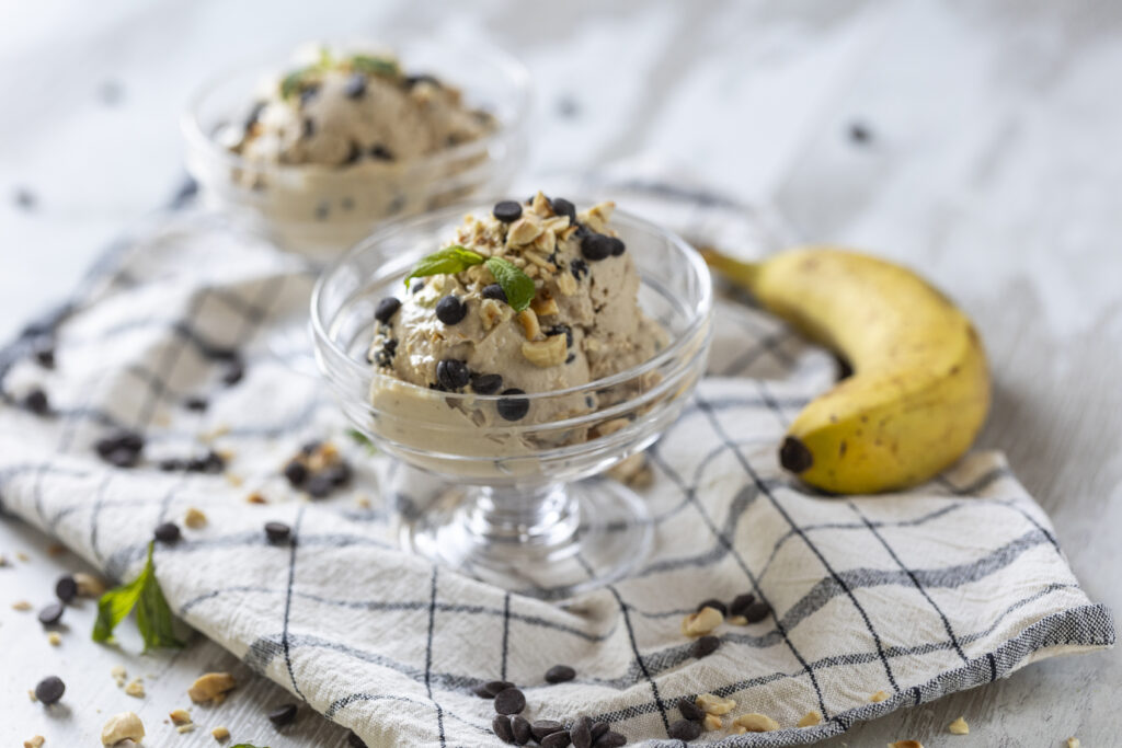 Frozen yogurt με μπανάνα, φιστικοβούτυρο και κομμάτια σοκολάτας