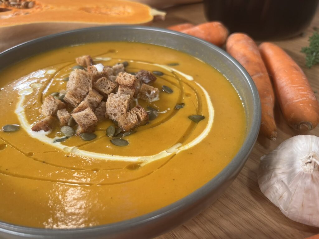 Σούπα βελουτέ από ψητές κολοκύθες με τραγανά κρουτόν