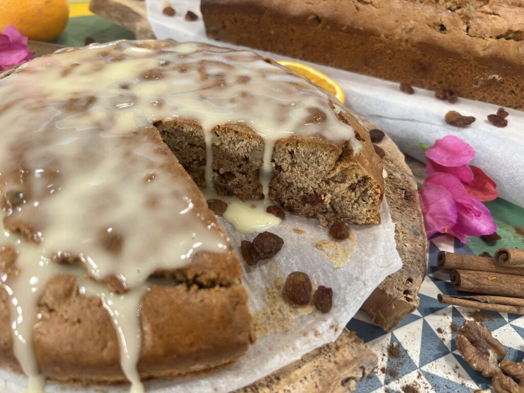 Κέικ με σταφίδες, καρύδια και επικάλυψη από γλάσο πορτοκαλιού