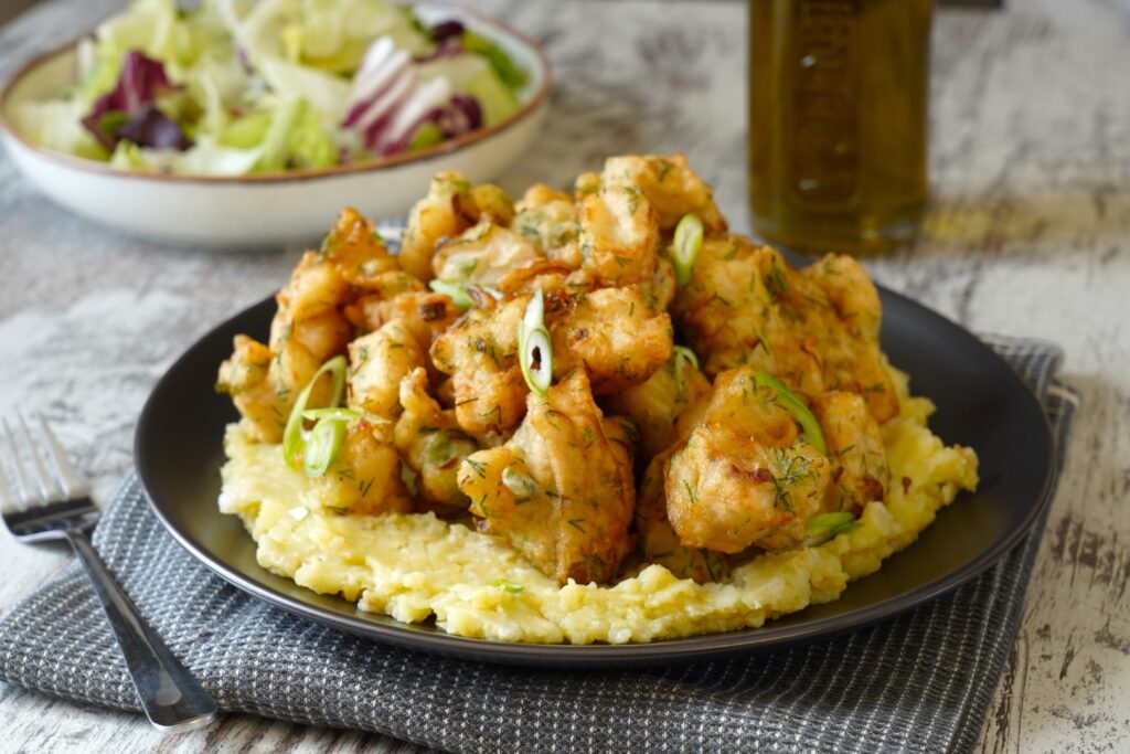 Λουκουμάδες μπακαλιάρου με σκορδαλιά από ψητό σκόρδο και σαλάτα από παντζάρια