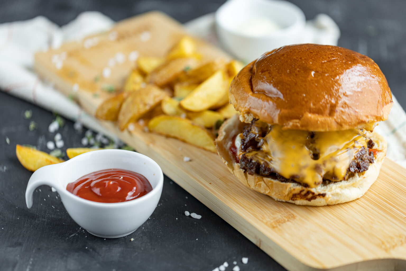 •Μόλις γυρίσουμε πλευρά στα μπιφτέκια, προσθέτουμε δύο φέτες τυρί τσένταρ σε κάθε μπιφτέκι.