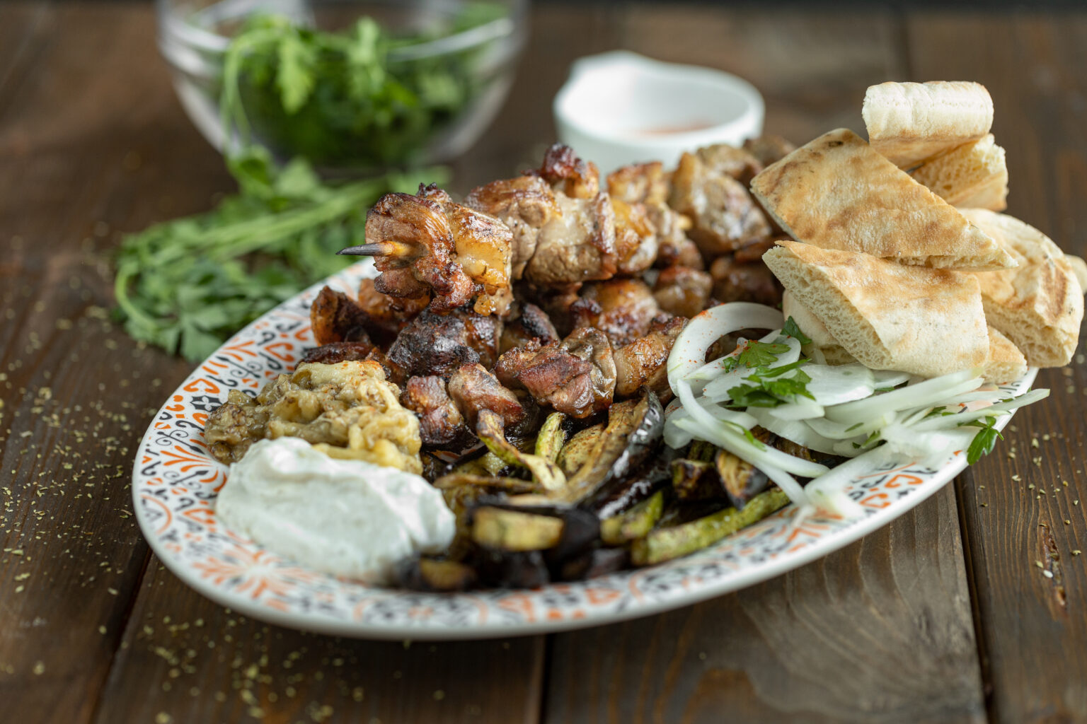 • Σε μία πιατέλα σερβιρίσματος τοποθετούμε τα ψητά λαχανικά, τη μελιτζανοσαλάτα, τη σος γιαουρτιού, το κρεμμύδι και στο πλάι τις πίτες κομμένες σε ακανόνιστα κομμάτια.