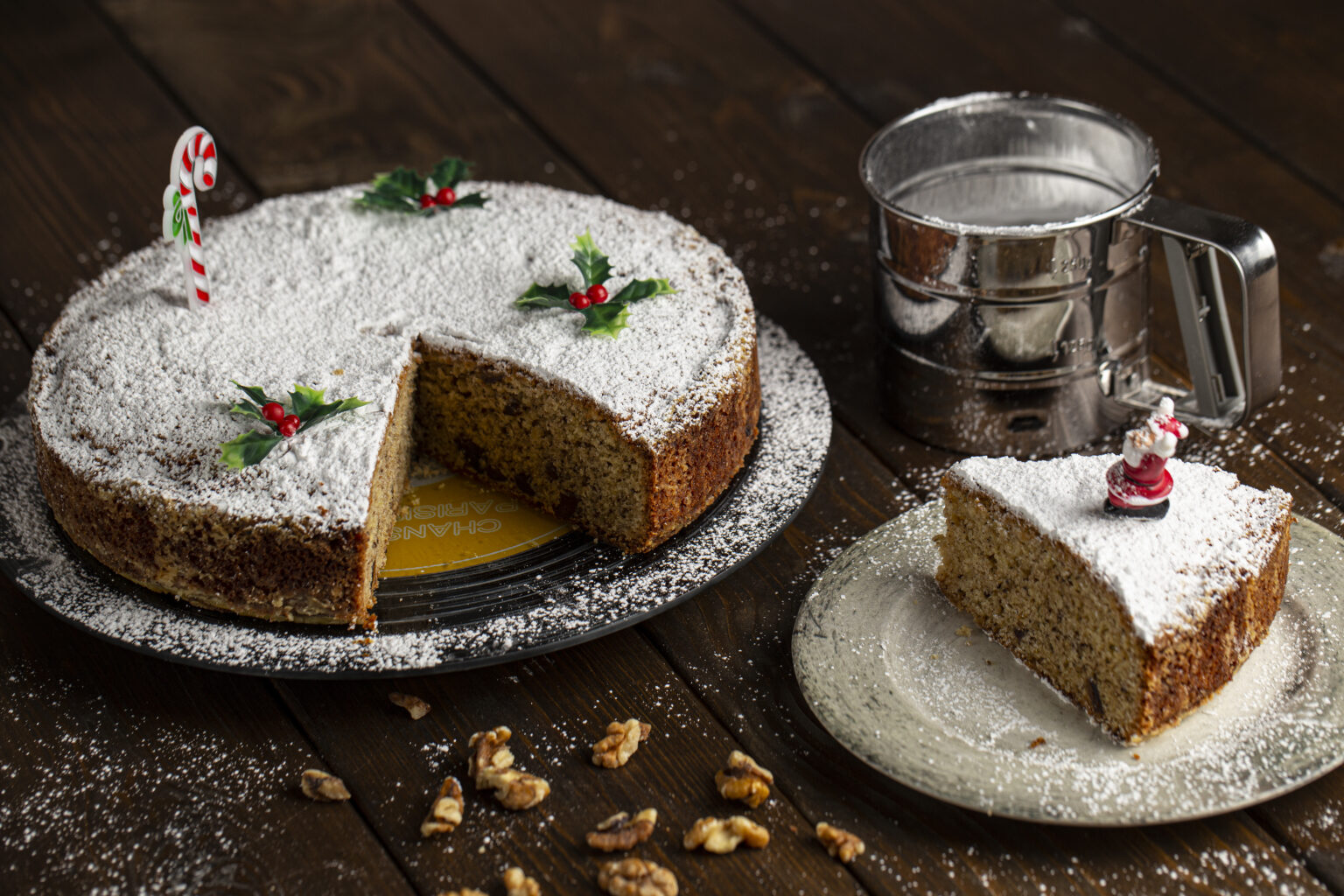• Γαρνίρουμε με την άχνη ζάχαρη και διακοσμούμε τη βασιλόπιτα με χριστουγεννιάτικα στολίδια.