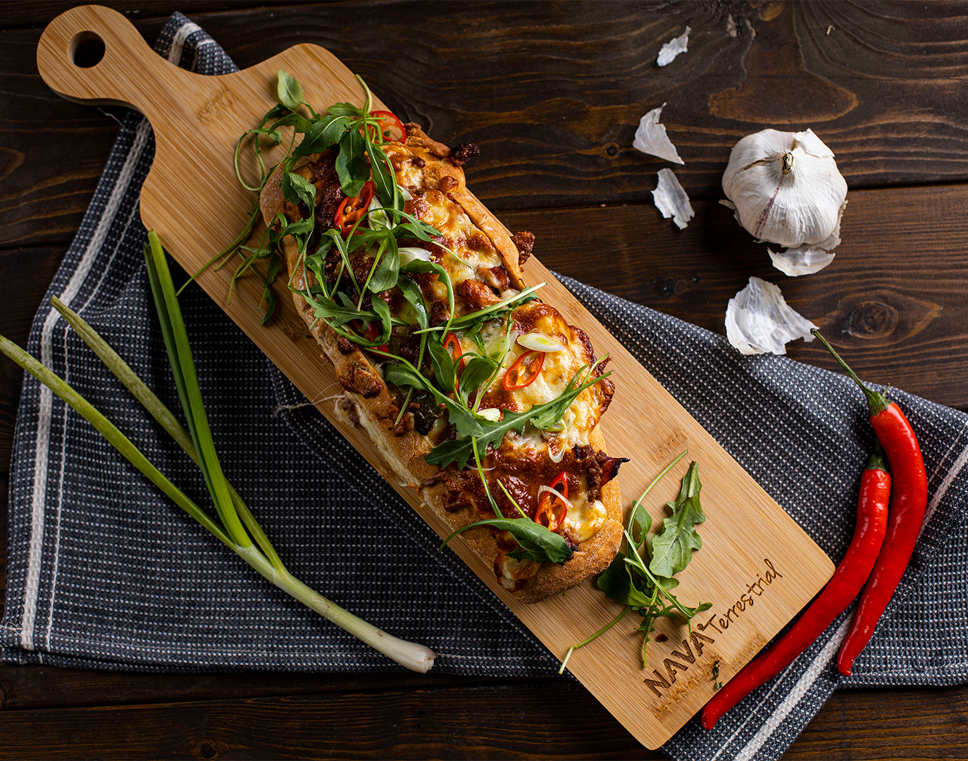 • Μόλις ψηθεί το καρβελάκι γαρνίρουμε με ρόκα, φρέσκο κρεμμυδάκι και μία πιπεριά τσίλι, ψιλοκομμένα.