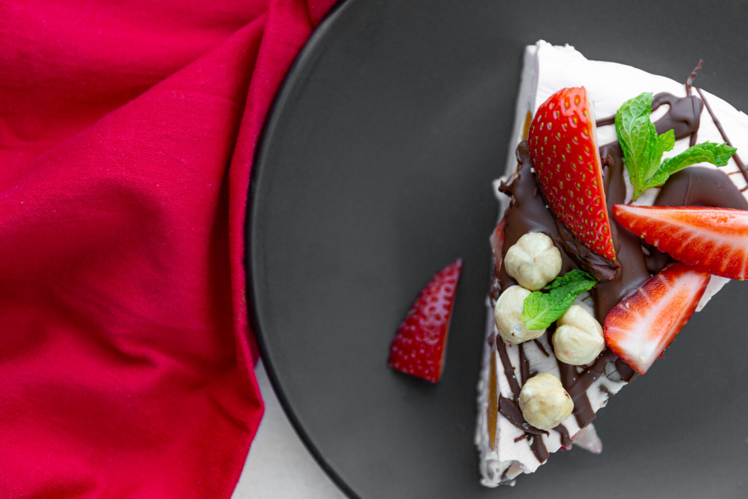 • Προσθέτουμε από πάνω τις φράουλες κομμένες στη μέση.