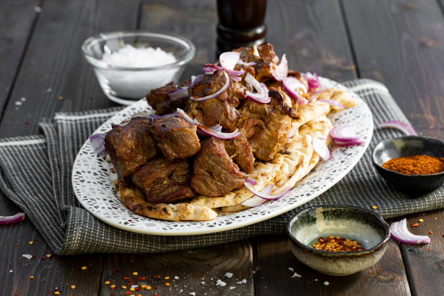• Κόβουμε τις ψημένες πίτες, προσθέτουμε τα κομμάτια από το κοντοσούβλι, το κρεμμύδι κομμένο σε λεπτές φέτες, το μηλόξιδο και την πάπρικα και σερβίρουμε.