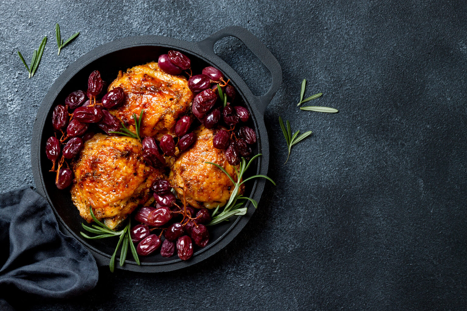 • Προσθέτουμε στην κατσαρόλα τα σταφύλια, τα φρέσκα μυρωδικά, αλάτι και φρεσκοτριμμένο πιπέρι, ανακατεύοντας.