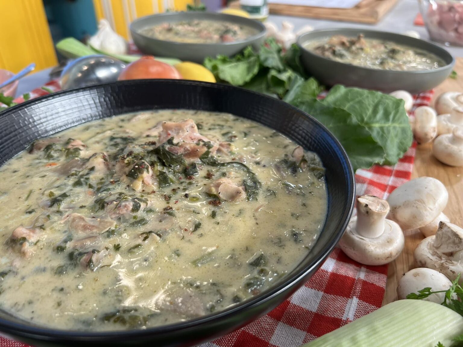 Κοτόπουλο φρικασέ με μανιτάρια και χόρτα εποχής
