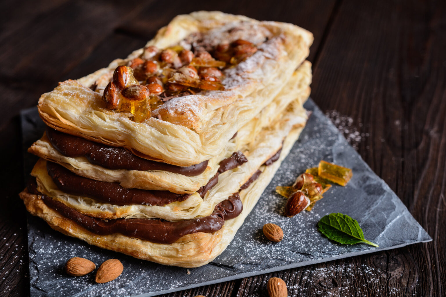 • Σε ένα ξύλο κοπής απλώνουμε με το κορνέ λίγη κρέμα σοκολάτας και τοποθετούμε από πάνω το πρώτο φύλλο σφολιάτας, ώστε να κολλήσει.
