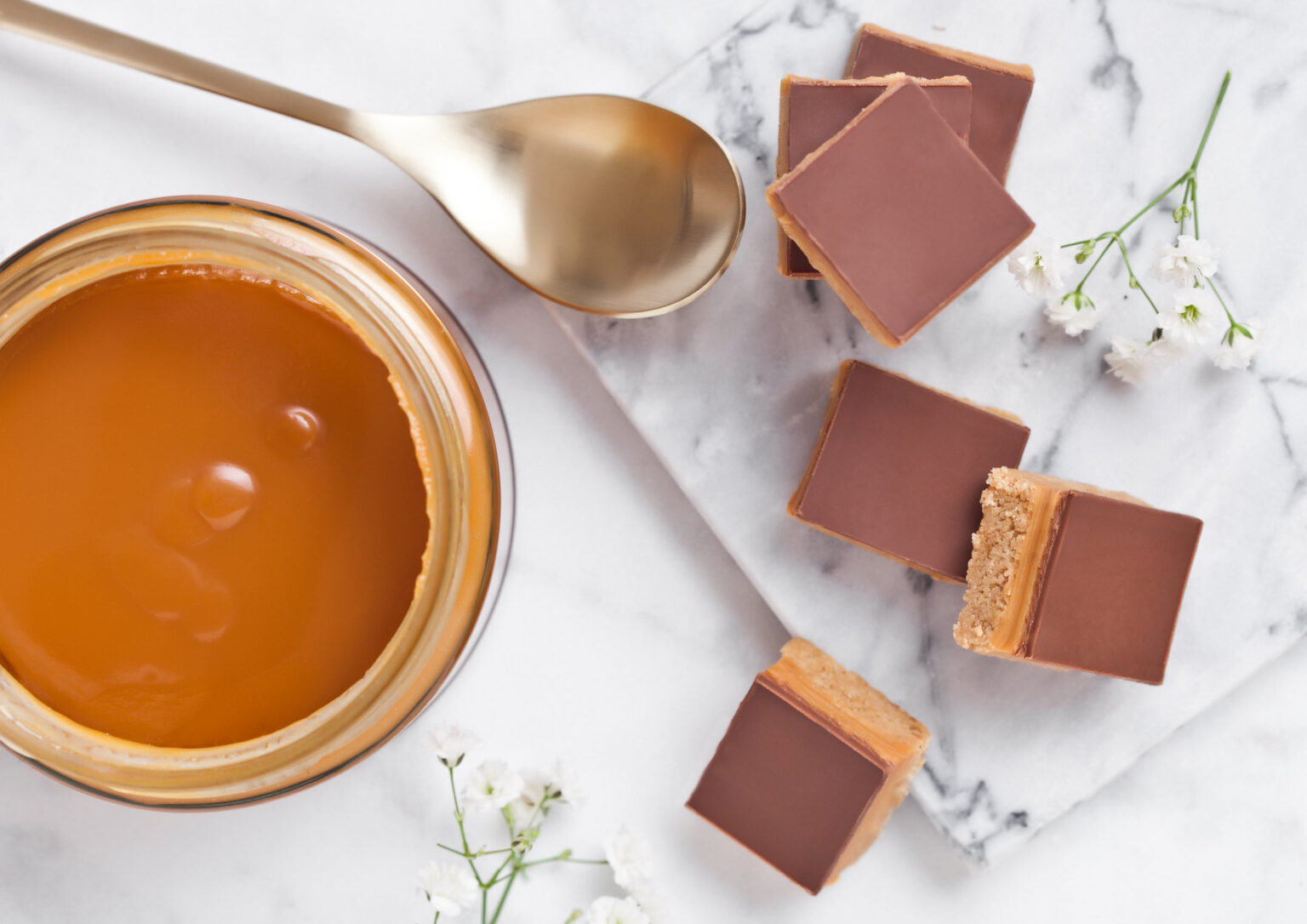 • Βγάζουμε από το ψυγείο το ταψί και απλώνουμε ομοιόμορφα πάνω από το ζαχαρούχο γάλα τη λιωμένη κουβερτούρα με το φιστικοβούτυρο.
