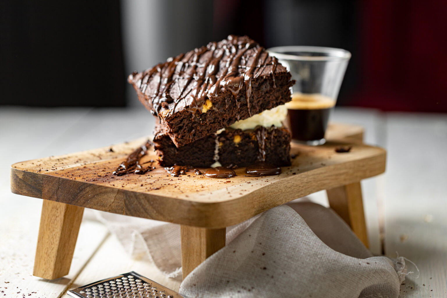 • Με ένα κουτάλι ρίχνουμε τη λιωμένη σοκολάτα ακανόνιστα πάνω από τα μπράουνις.