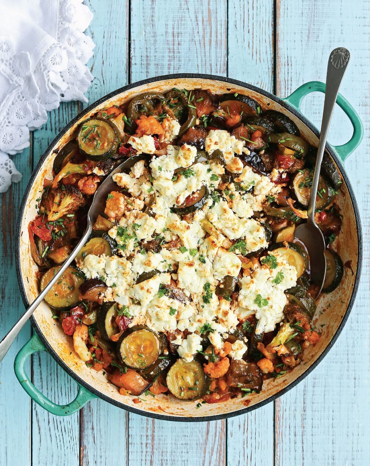 • Αφαιρούμε το αλουμινόχαρτο από το ταψί, πασπαλίζουμε ομοιόμορφα τα λαχανικά με τη φέτα θρυμματισμένη και συνεχίζουμε το ψήσιμο για 20-25 λεπτά.