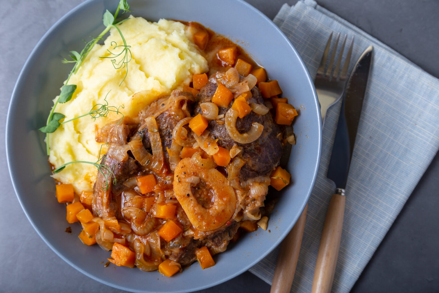 • Σερβίρουμε σε μεγάλη πιατέλα τον πουρέ παστινάκι με το οσομπούκο και τη σάλτσα.