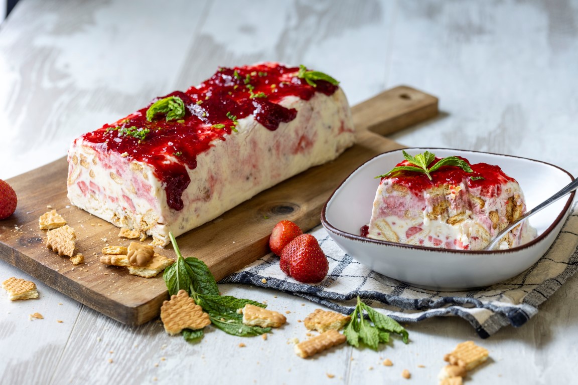 • Αφαιρούμε τον κάδο από το μίξερ, κόβουμε τις υπόλοιπες φράουλες σε μικρά κομμάτια και τις προσθέτουμε μέσα, μαζί με τα μπισκότα, σπασμένα σε μικρά ακανόνιστα κομμάτια.