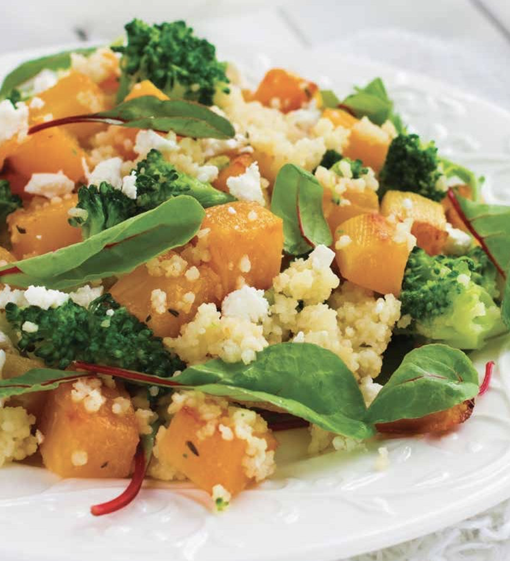 • Σε ένα μπολ προσθέτουμε το βραστό νερό και το κους κους και ανακατεύουμε καλά, με ένα κουτάλι.