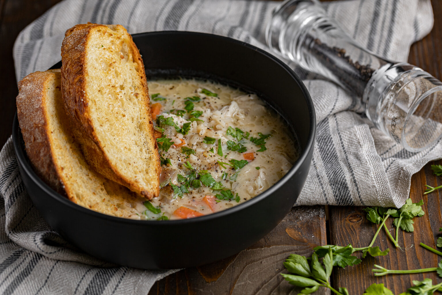 • Σερβίρουμε την κοτόσουπα σε βαθύ πιάτο με τραγανές φέτες ψωμιού.
