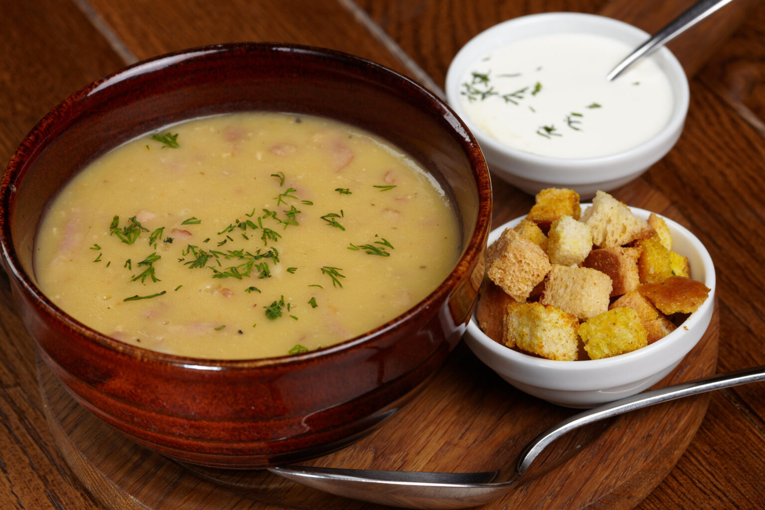 • Σερβίρουμε τη σούπα σε ένα βαθύ πιάτο, προσθέτοντας το κοτόπουλο, τα κρουτόν, το μπέικον σπασμένο σε κομμάτια από πάνω και λίγο άνηθο.