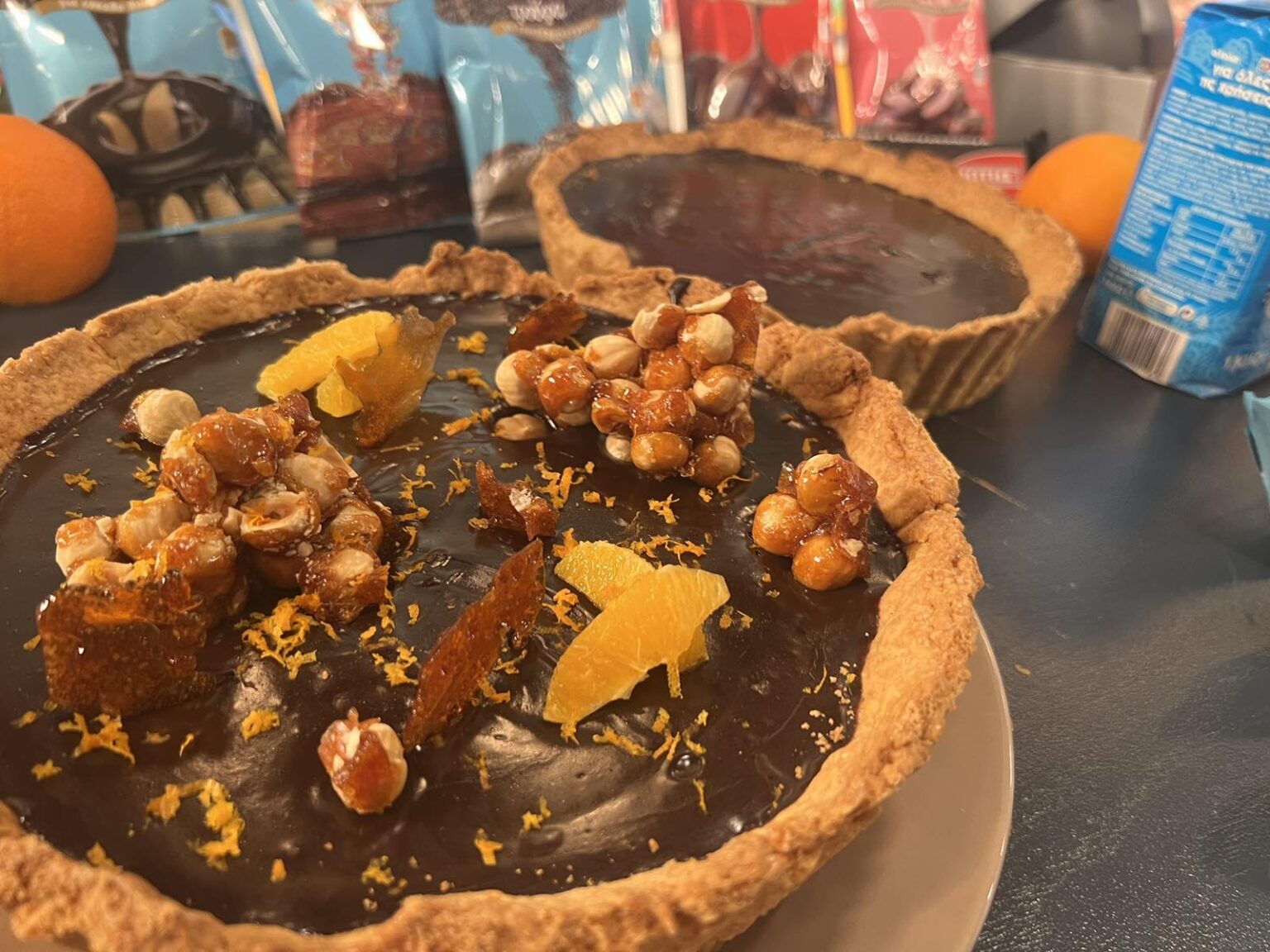 • Βγάζουμε την τάρτα από το ψυγείο και γαρνίρουμε από πάνω με το κροκάν φουντουκιού.
