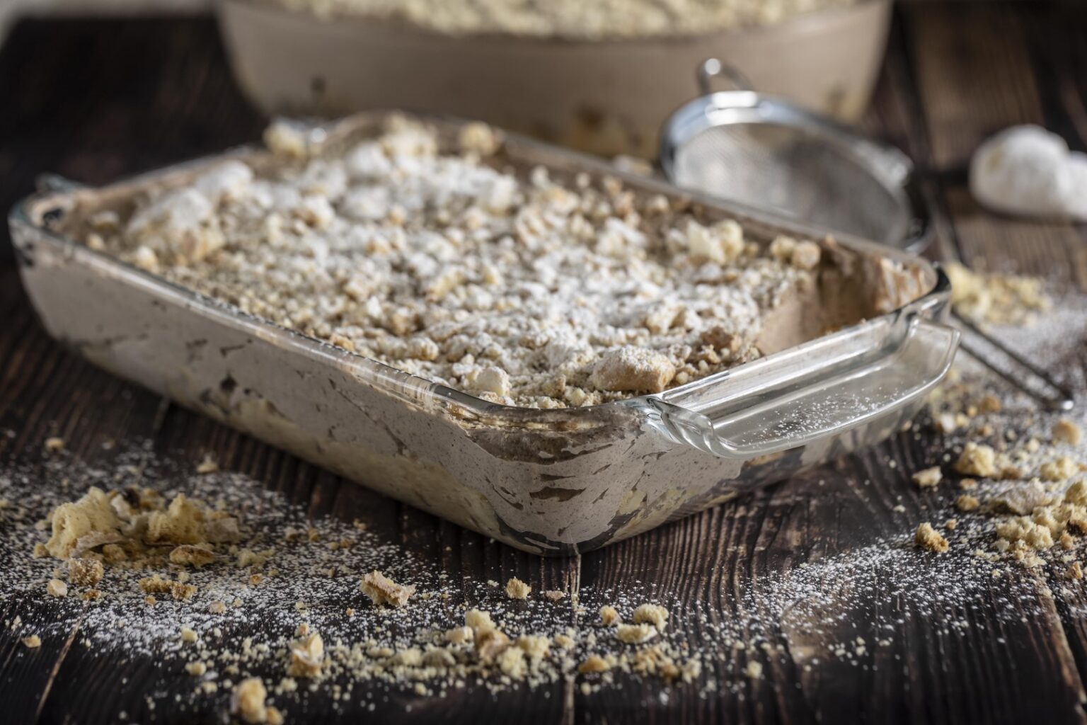 • Κρατάμε 2 κουραμπιέδες στην άκρη και σπάμε τους υπόλοιπους σε μεγάλα κομμάτια με τα χέρια μας, τους προσθετουμε στο μπολ με τον καφέ, ανακατεύουμε με ένα μεγάλο κουτάλι, ώστε να τον απορροφήσουν και τους στρώνουμε ομοιόμορφα στη βάση από ένα πυρίμαχο ταψί 30x22εκ., μέχρι να την καλύψουμε.