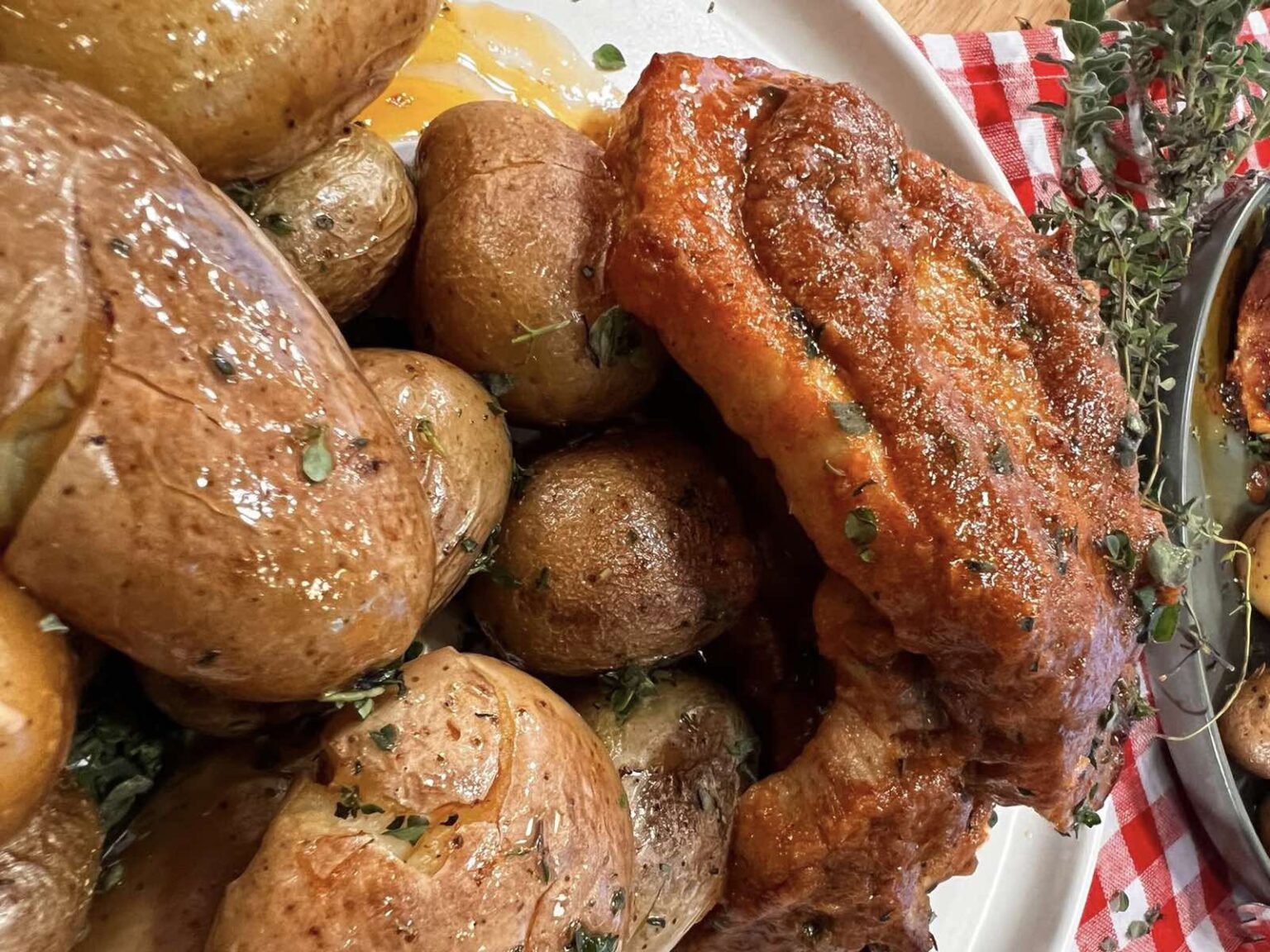 Χοιρινά μπριζολάκια με σάλτσα μουστάρδας και πατάτες στο τηγάνι