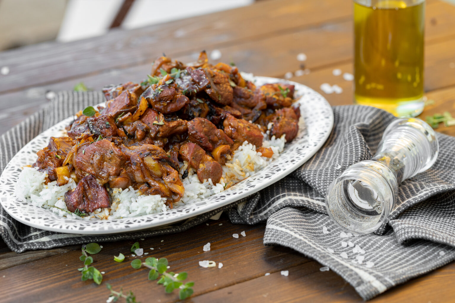 • Σερβίρουμε το ρύζι σε ένα πιάτο με το χοιρινό από πάνω και το φρέσκο μαϊντανό ψιλοκομμένο.