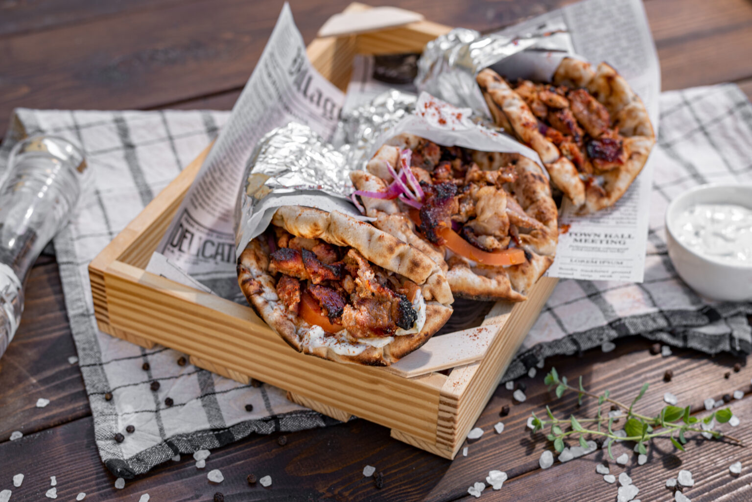 • Σε κάθε πίτα απλώνουμε λίγο τζατζίκι, προσθέτουμε μία ποσότητα από το γύρο χοιρινό, το κρεμμύδι και την ντομάτα κομμένα σε λεπτές φέτες, πασπαλίζουμε με πάπρικα και τυλίγουμε με ένα κομμάτι αντικολλητικό χαρτί και αλουμινόχαρτο.