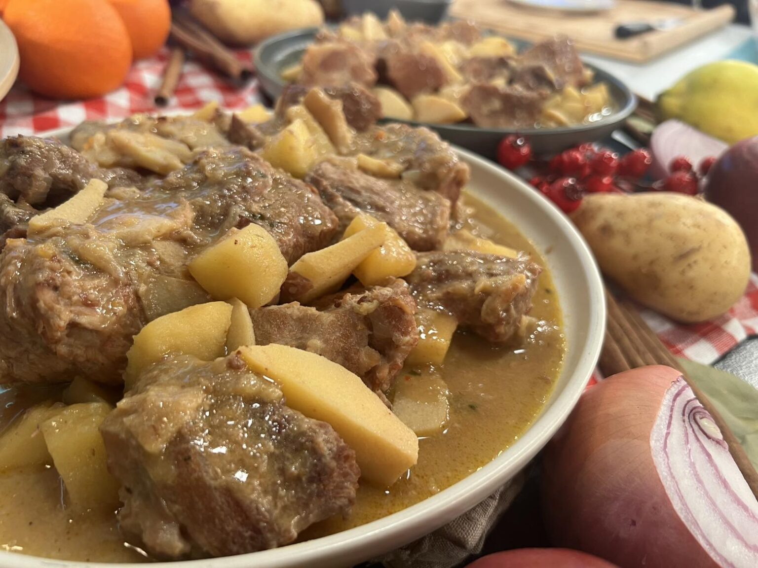 • Φοράμε γάντια, κόβουμε σε μέτριες μερίδες το χοιρινό, το μεταφέρουμε σε ένα μπολ, το πασπαλίζουμε με το αλεύρι, προσθέτουμε λίγο αλάτι, πιπέρι και αναμειγνύουμε τα υλικά μεταξύ τους.