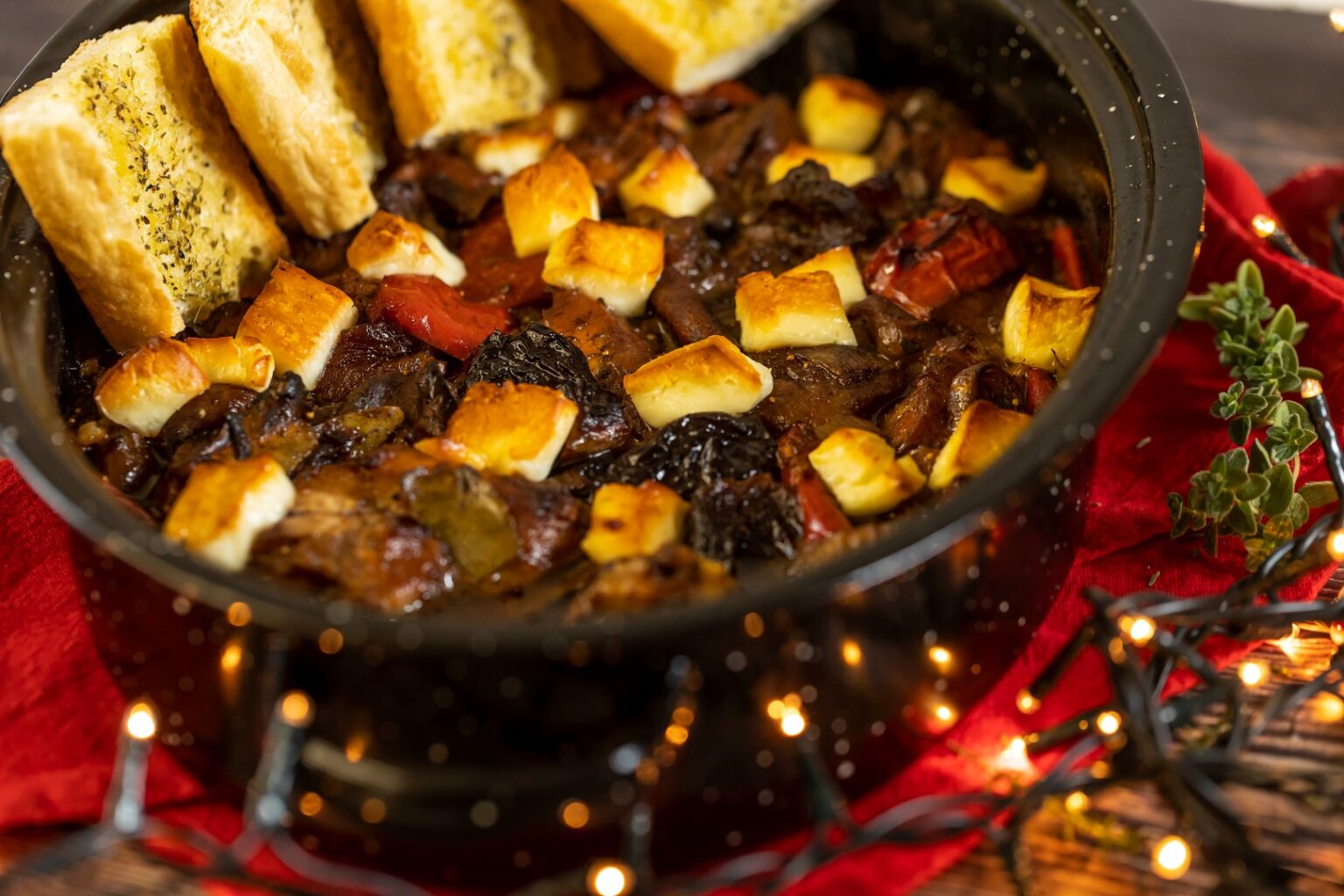 • Κόβουμε το χαλούμι σε μέτριους κύβους, βγάζουμε από το φούρνο τη γάστρα, αφαιρούμε το καπάκι, ρίχνουμε με ένα κουτάλι λίγο ζωμό ψησίματος επάνω στο κρέας, τοποθετούμε τους κύβους χαλούμι σε διάφορα σημεία επάνω από το φαγητό και το ψήνουμε για ακόμα 15-20 λεπτά.