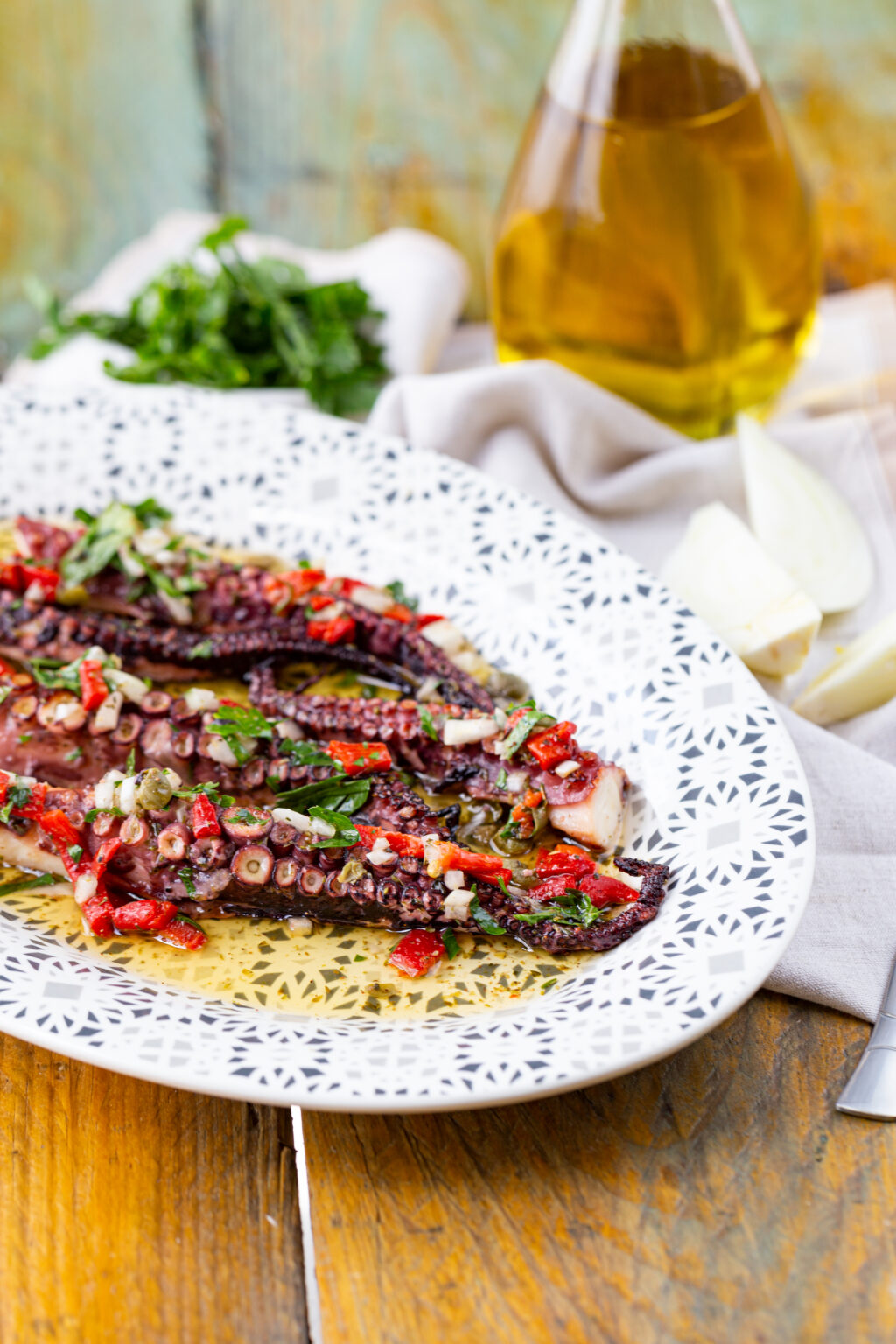 • Μόλις το χταπόδι κρυώσει, προσθέτουμε τη μαρινάδα, καλύπτουμε με μεμβράνη και αφήνουμε να μαριναριστεί, ιδανικά, για 12 ώρες.