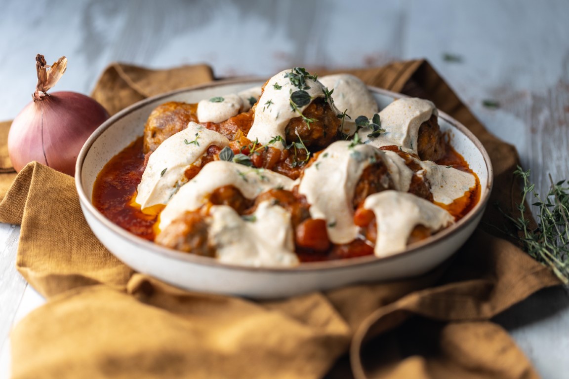 Αρνίσια κεφτεδάκια με κόκκινη σάλτσα και αρωματικό γιαούρτι