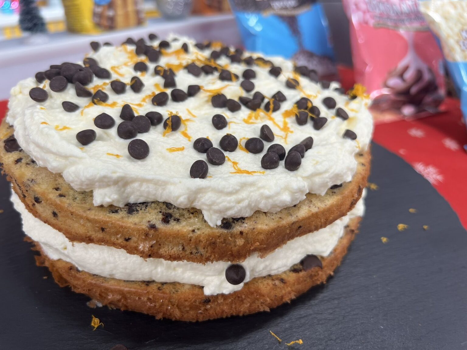 • Ρίχνουμε με ένα κουτάλι το μισό γλάσο πάνω στο κέικ και πασπαλίζουμε με σταγόνες σοκολάτας.
