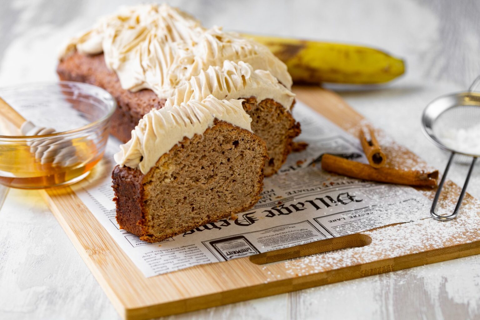 • Απλώνουμε το κρύο frosting στο ζεστό banana bread και σερβίρουμε.