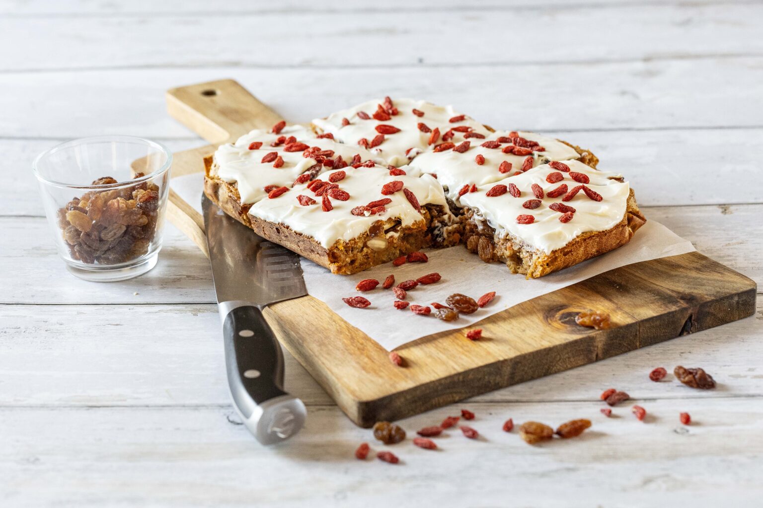 • Σε ένα μπολ ανακατεύουμε το τυρί κρέμα με το μέλι, με ένα κουτάλι απλώνουμε ομοιόμορφα επάνω από το κρύο carrot cake και πασπαλίζουμε με τα γκότζι μπέρι.