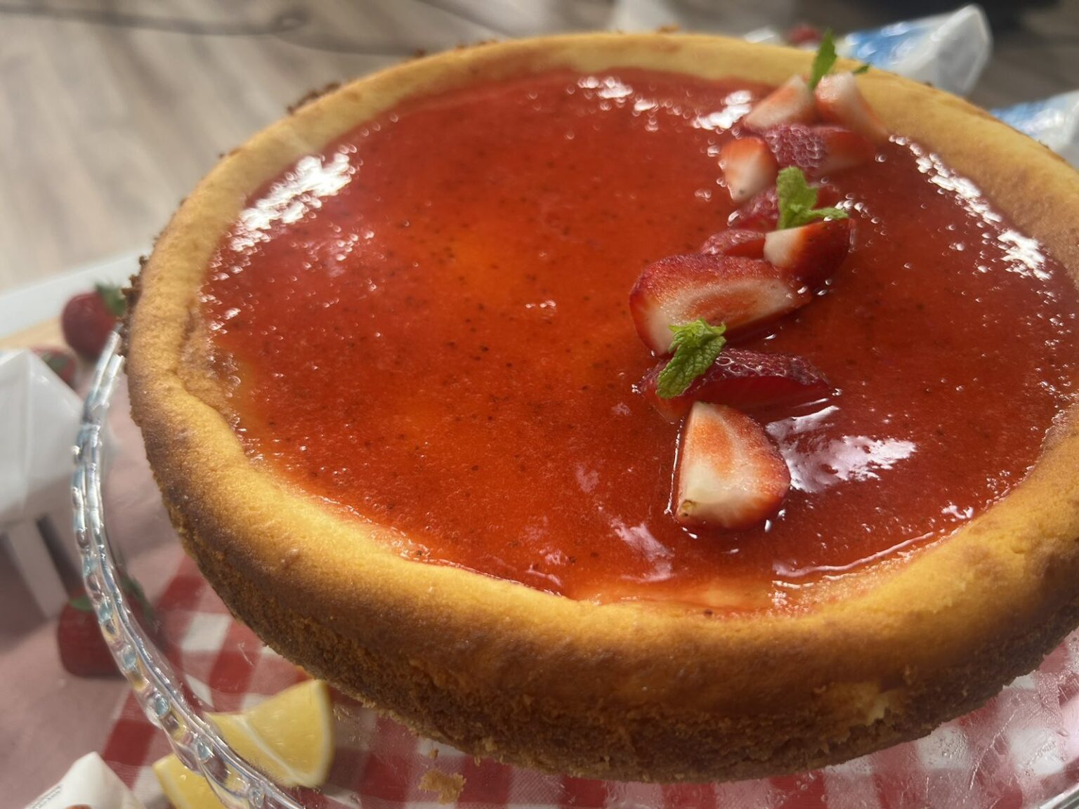 • Ξεφορμάρουμε το cheesecake με ανθότυρο, απλώνουμε ομοιόμορφα από πάνω τη μαρμελάδα φράουλα που ετοιμάσαμε και κόβουμε σε κομμάτια.
