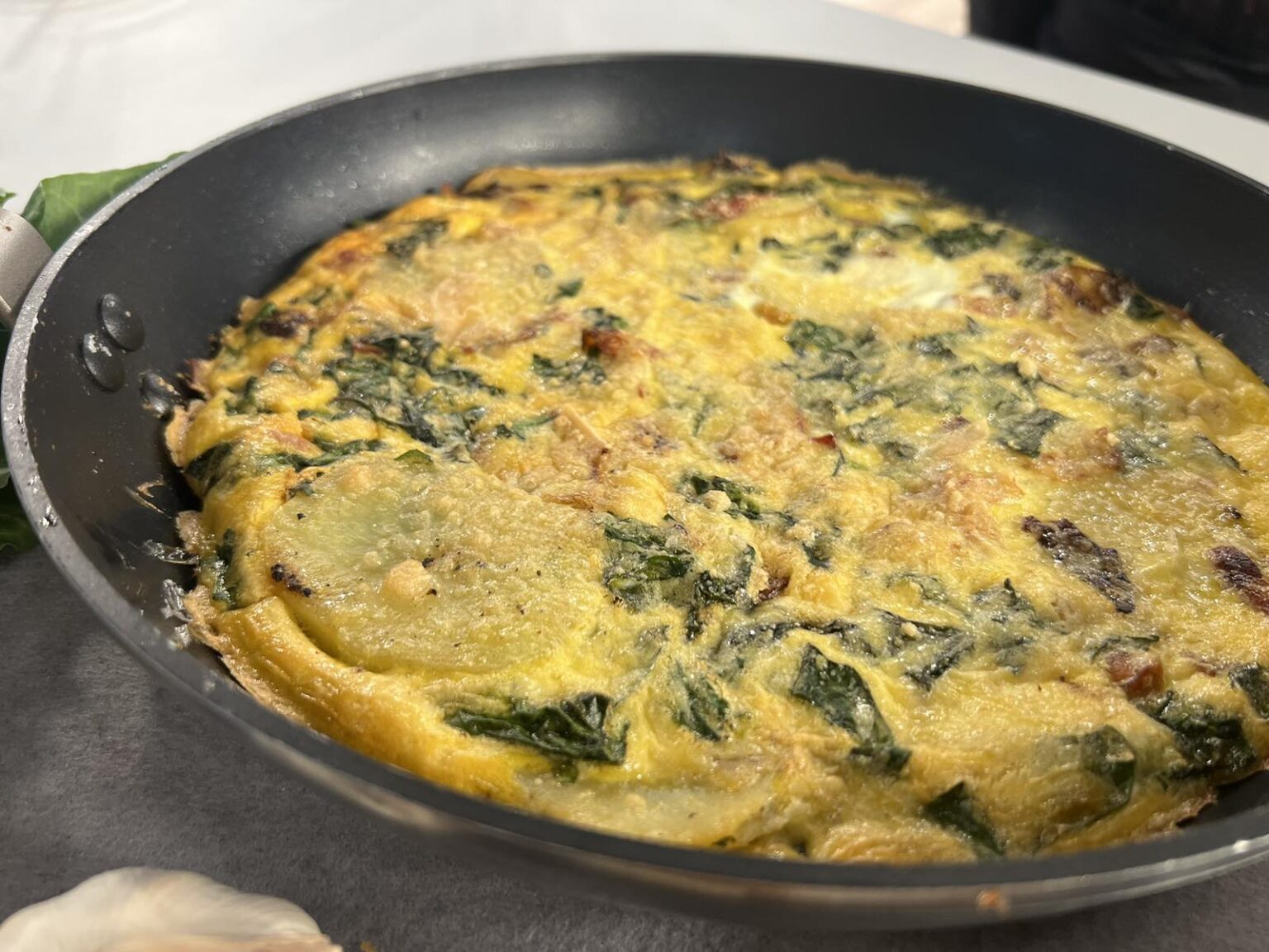 • Σε ένα μπολ χτυπάμε τα αυγά και τα προσθέτουμε στο μείγμα πατάτας-σέσκουλα, ανακατεύουμε απαλά και αφαιρούμε το τηγάνι από τη φωτιά.