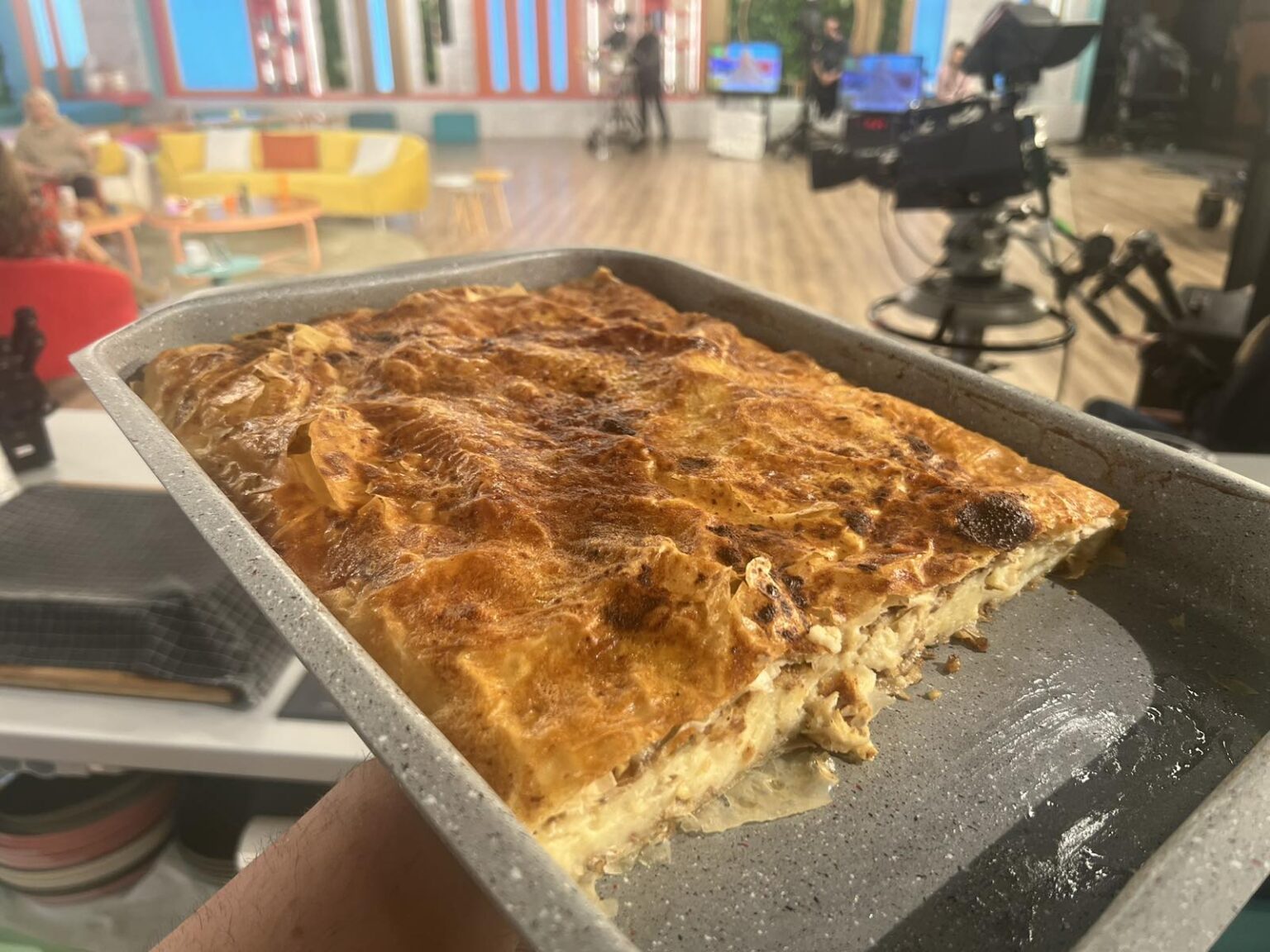 • Απλώνουμε την κρέμα ομοιόμορφα και γυρίζουμε τα φύλλα προς το εσωτερικό του ταψιού.