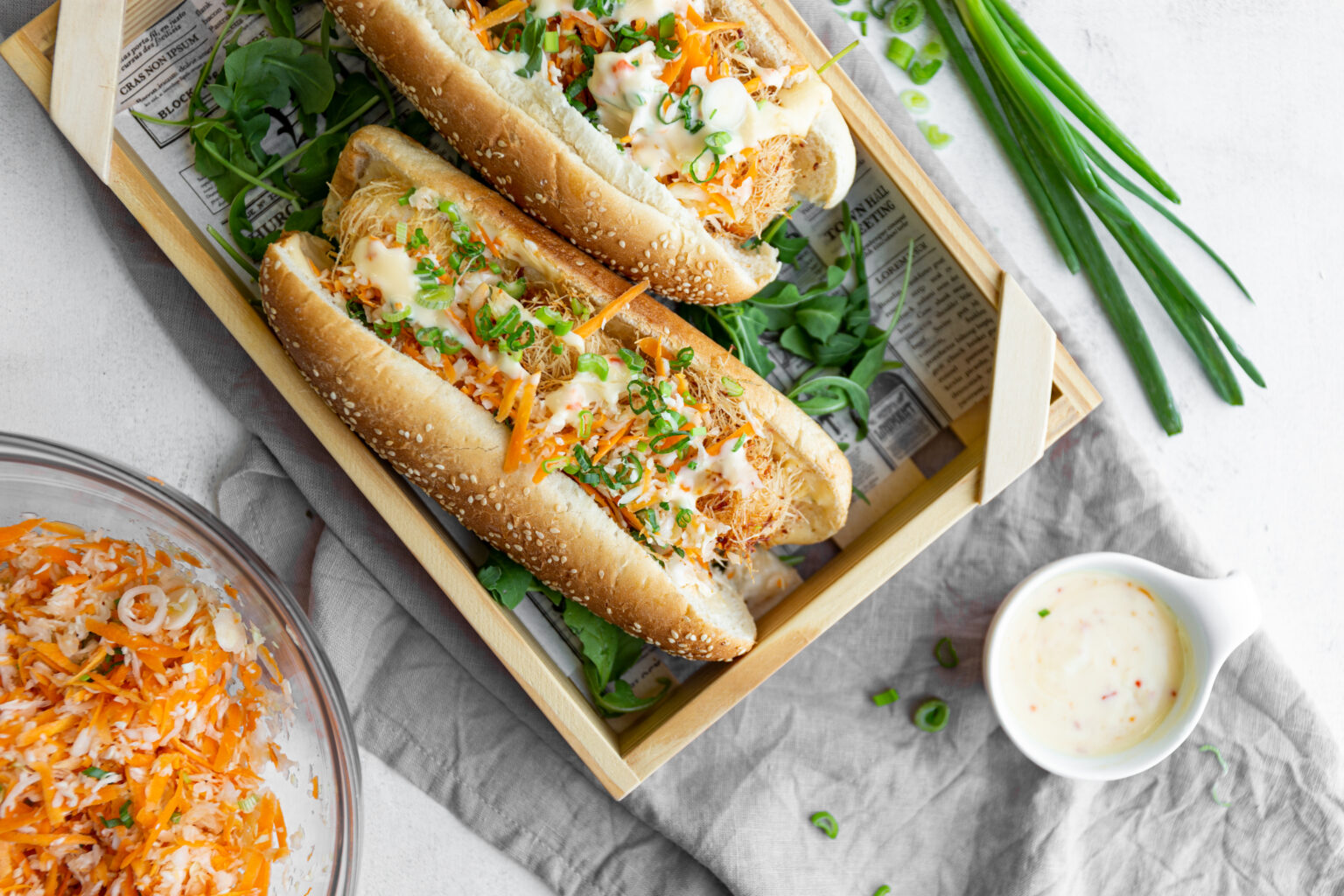 • Απλώνουμε σε κάθε ψωμάκι τη σος μαγιονέζας, προσθέτουμε τις γαρίδες, τη σαλάτα λάχανο-καρότο και το φρέσκο κρεμμύδι ψιλοκομμένο.