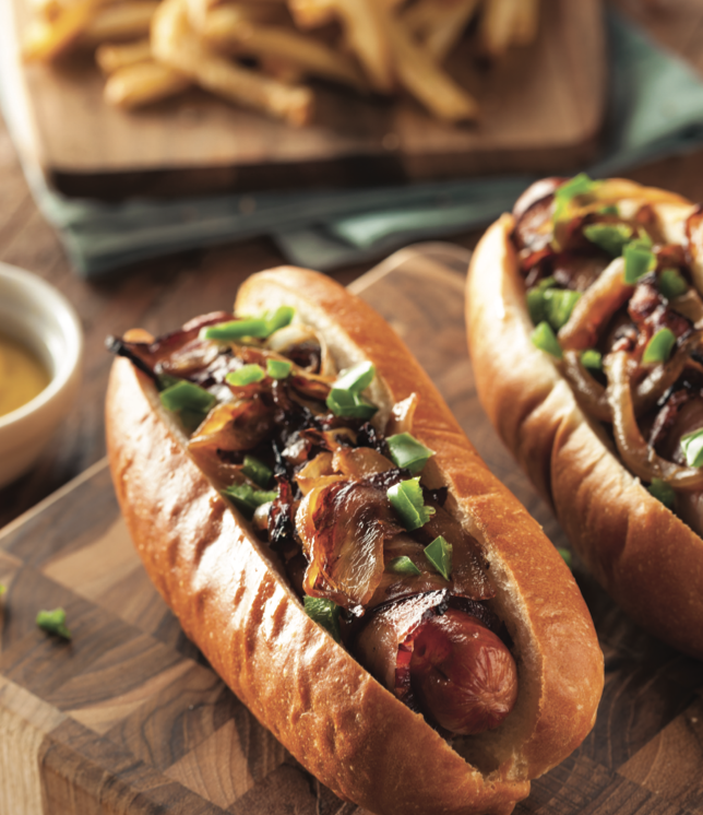 • Βάζουμε πάνω από τα λουκάνικα τα καραμελωμένα κρεμμύδια, κέτσαπ, μουστάρδα και μαγιονέζα.