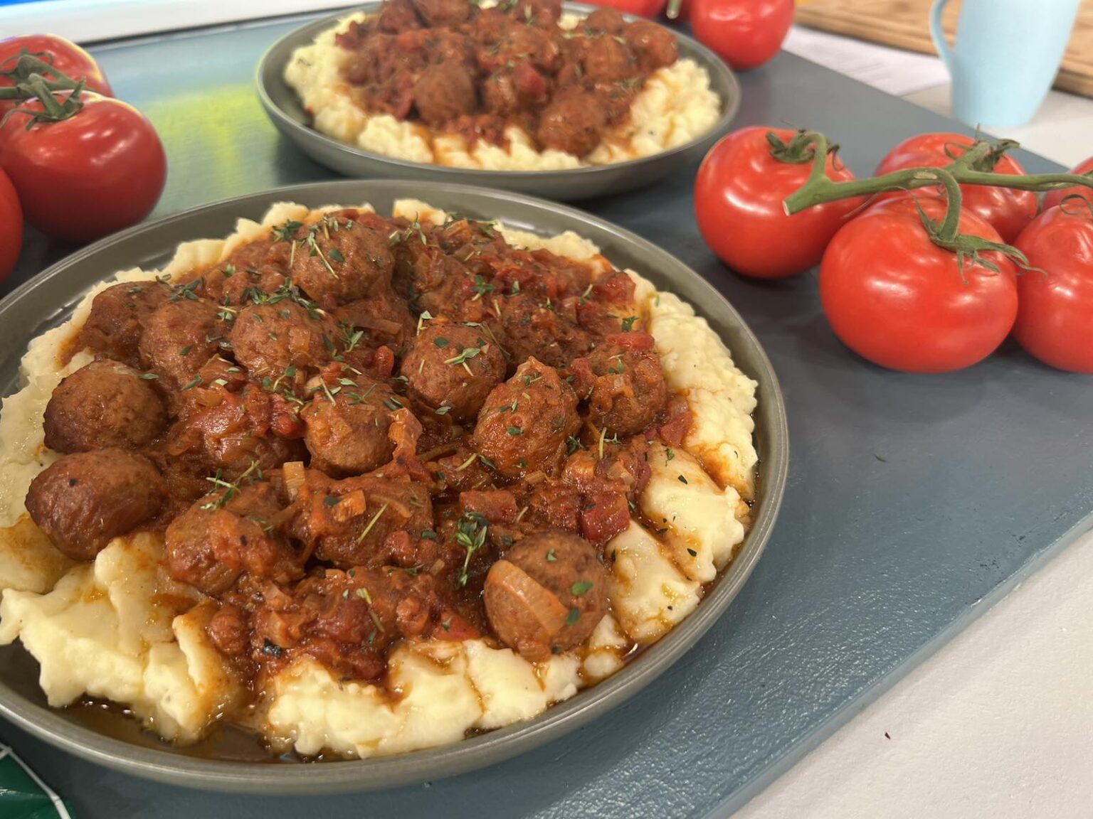 • Σερβίρουμε τον βελούδινο πουρέ σε ένα ρηχό πιάτο και σκεπάζουμε από πάνω με τα φυτικά κεφτεδάκια και τη σάλτσα.