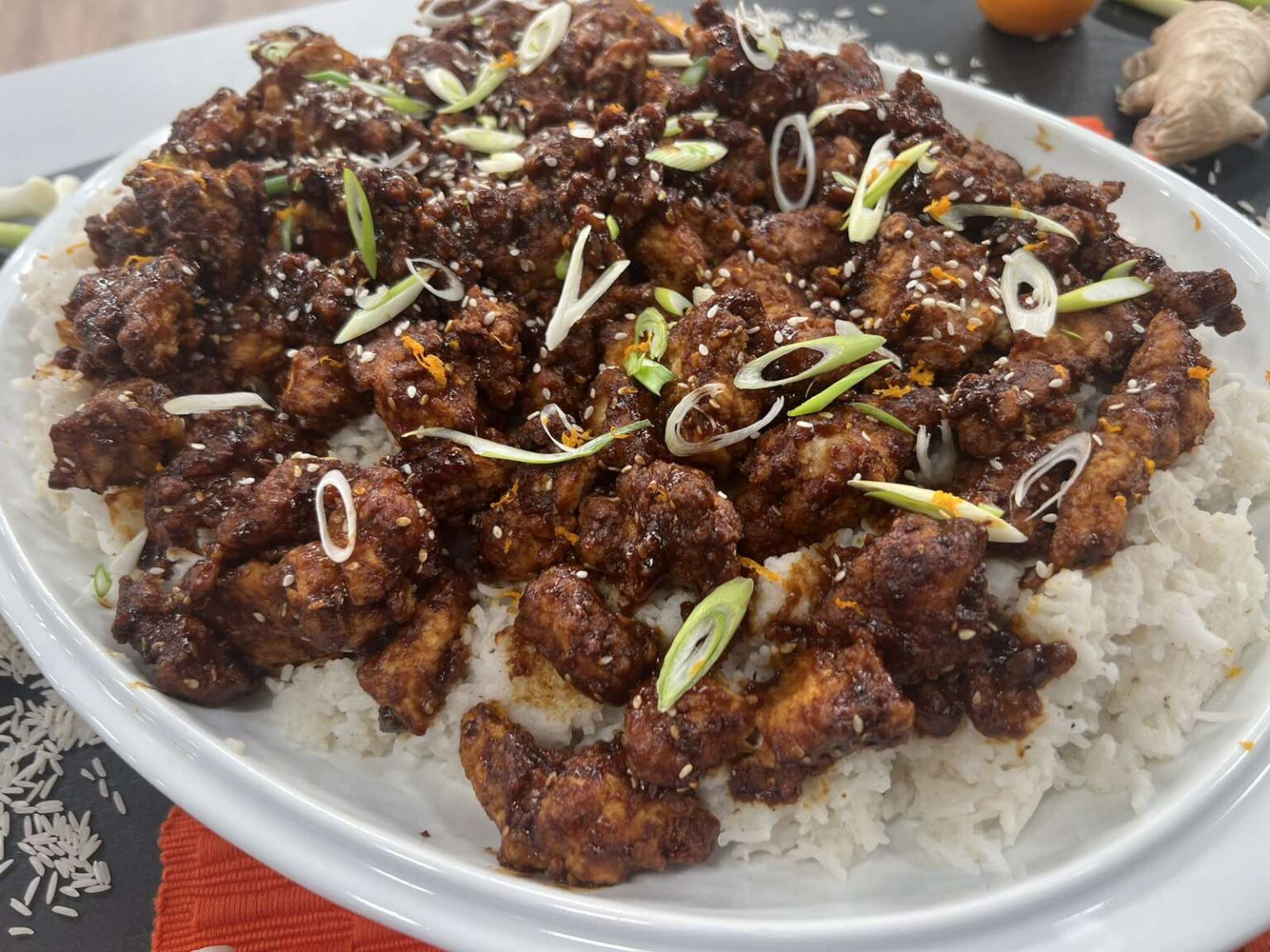 • Σερβίρουμε το κοτόπουλο γαρνιρισμένο με ξύσμα πορτοκαλιού, σουσάμι, φρέσκα κρεμμυδάκια ψιλοκομμένα και το συνοδεύουμε με ρύζι μπασμάτι.