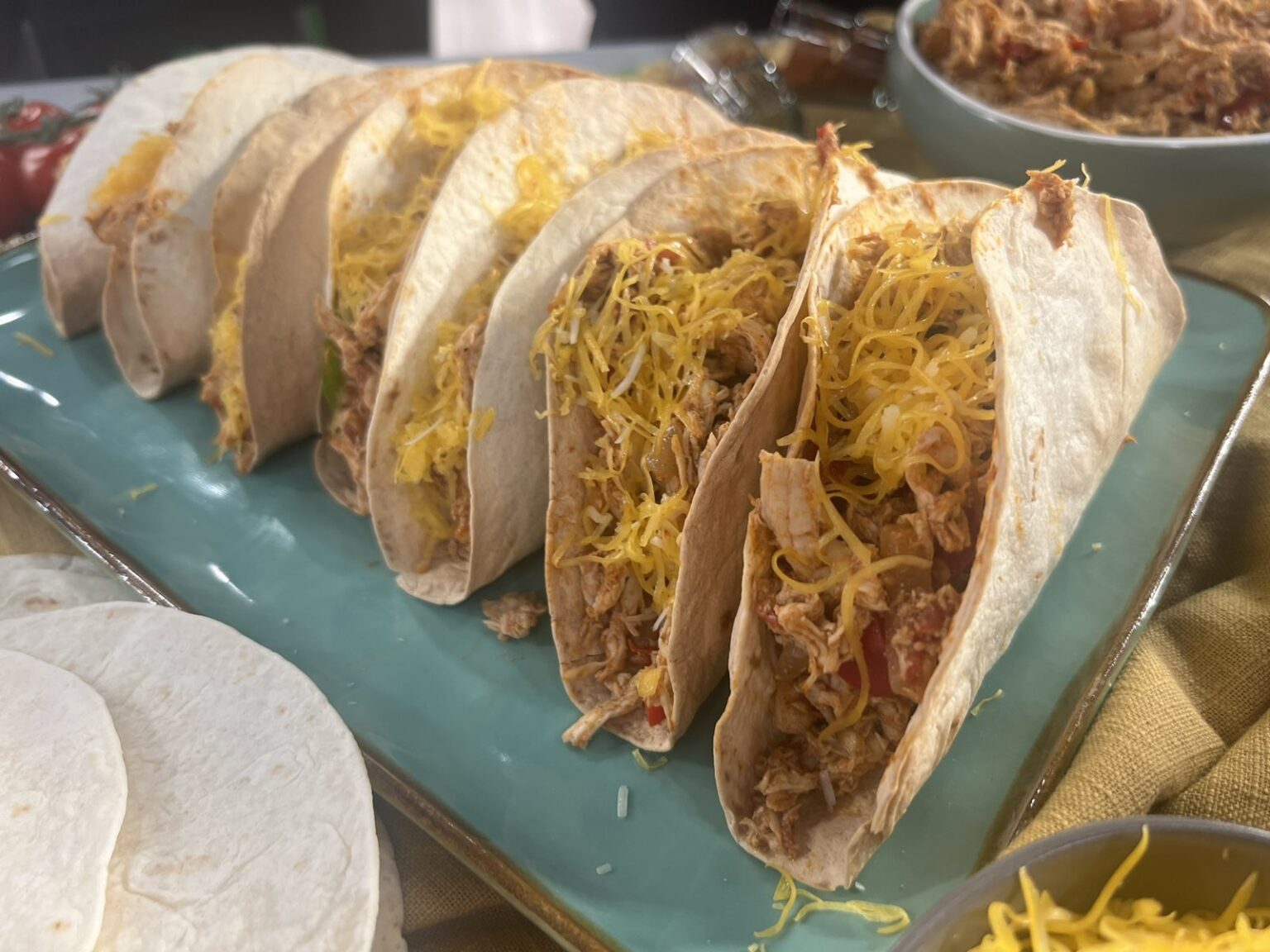 • Απλώνουμε τις τορτίγιες και μοιράζουμε το μείγμα με το κοτόπουλο, πασπαλίζουμε το τυρί και ρίχνουμε από πάνω τα ψιλοκομμένα φύλλα του κόλιανδρου.