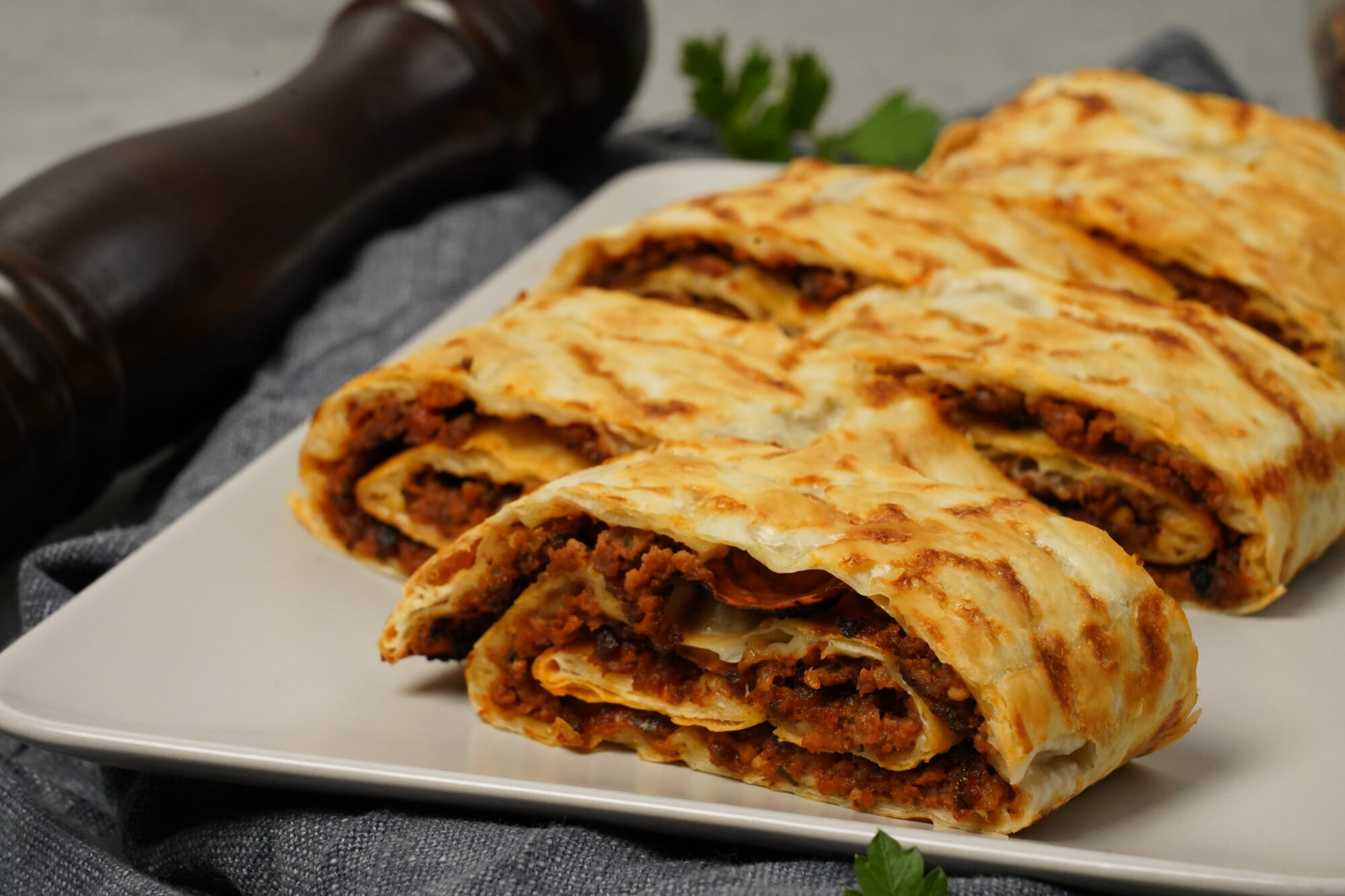 • Αφαιρούμε προσεκτικά την κρεατόπιτα από τον φούρνο και, όσο είναι ζεστή, τη τυλίγουμε σε ρολό με τη βοήθεια της λαδόκολλας, ξεκινώντας από τη μικρή της πλευρά.