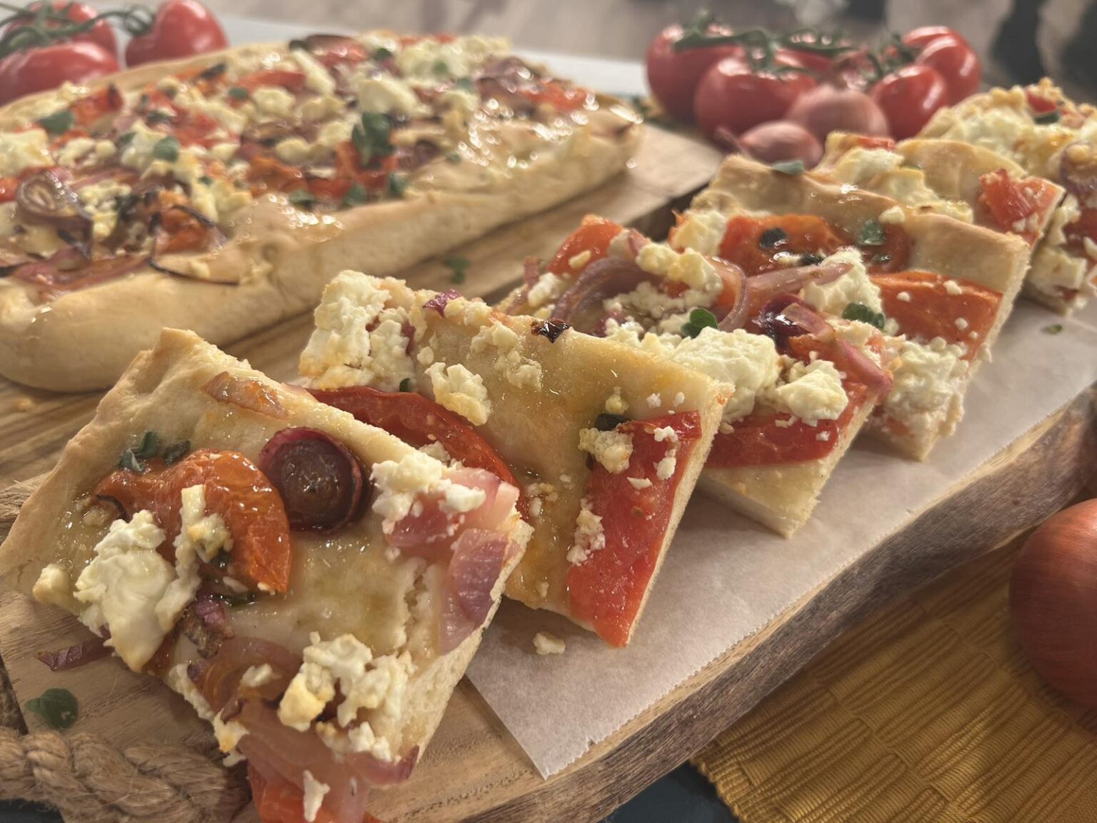 Λαδένια με ντομάτα, κρεμμύδι, φέτα και ρίγανη