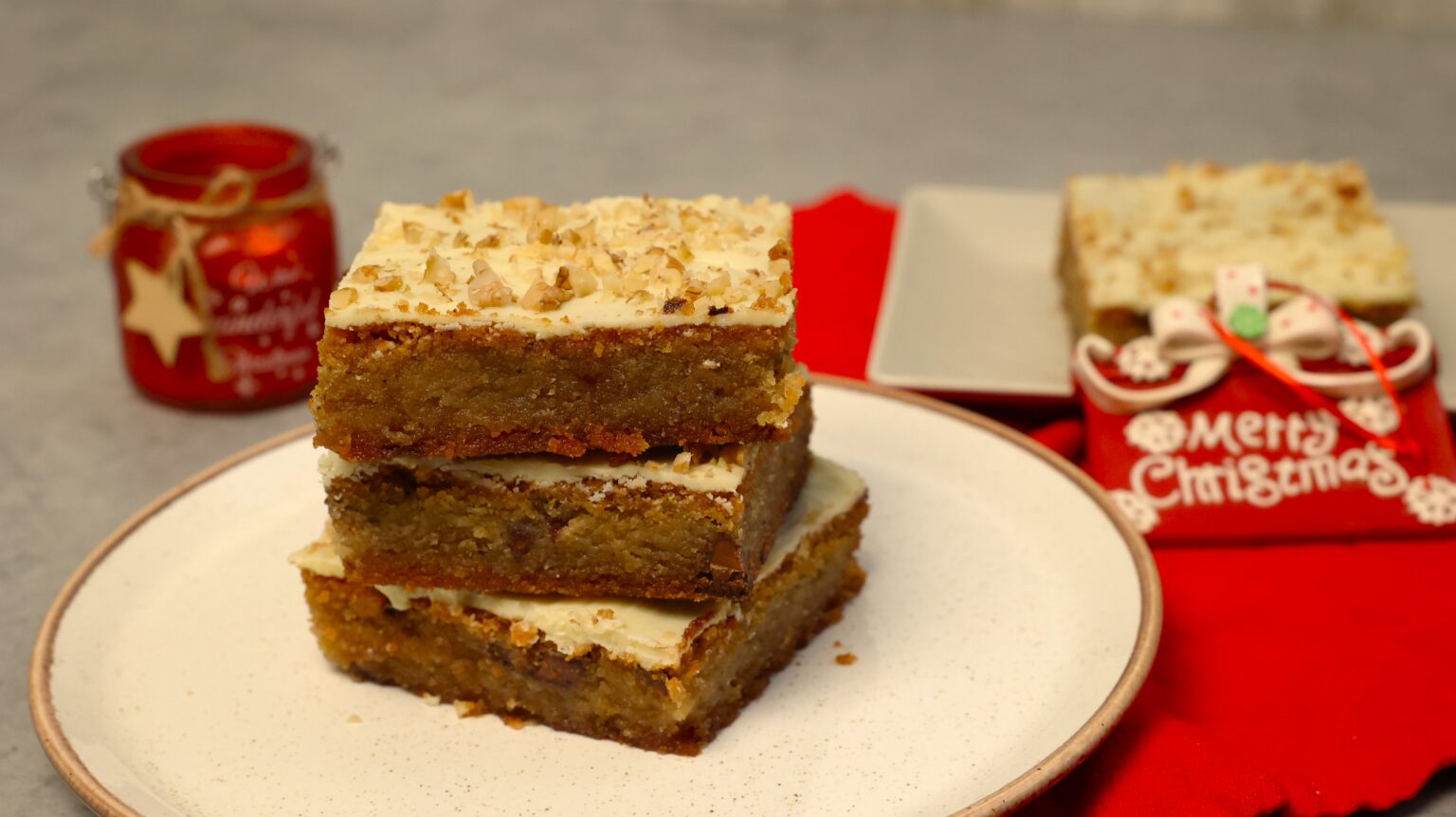 • Απλώνουμε στην επιφάνεια του γλυκού το γλάσο λευκής κουβερτούρας, σπάζουμε τα καρύδια σε μικρά κομμάτια, πασπαλίζουμε πάνω από το γλάσο και αφήνουμε για 2 ώρες να δέσει το γλυκό, σε θερμοκρασία δωματίου.